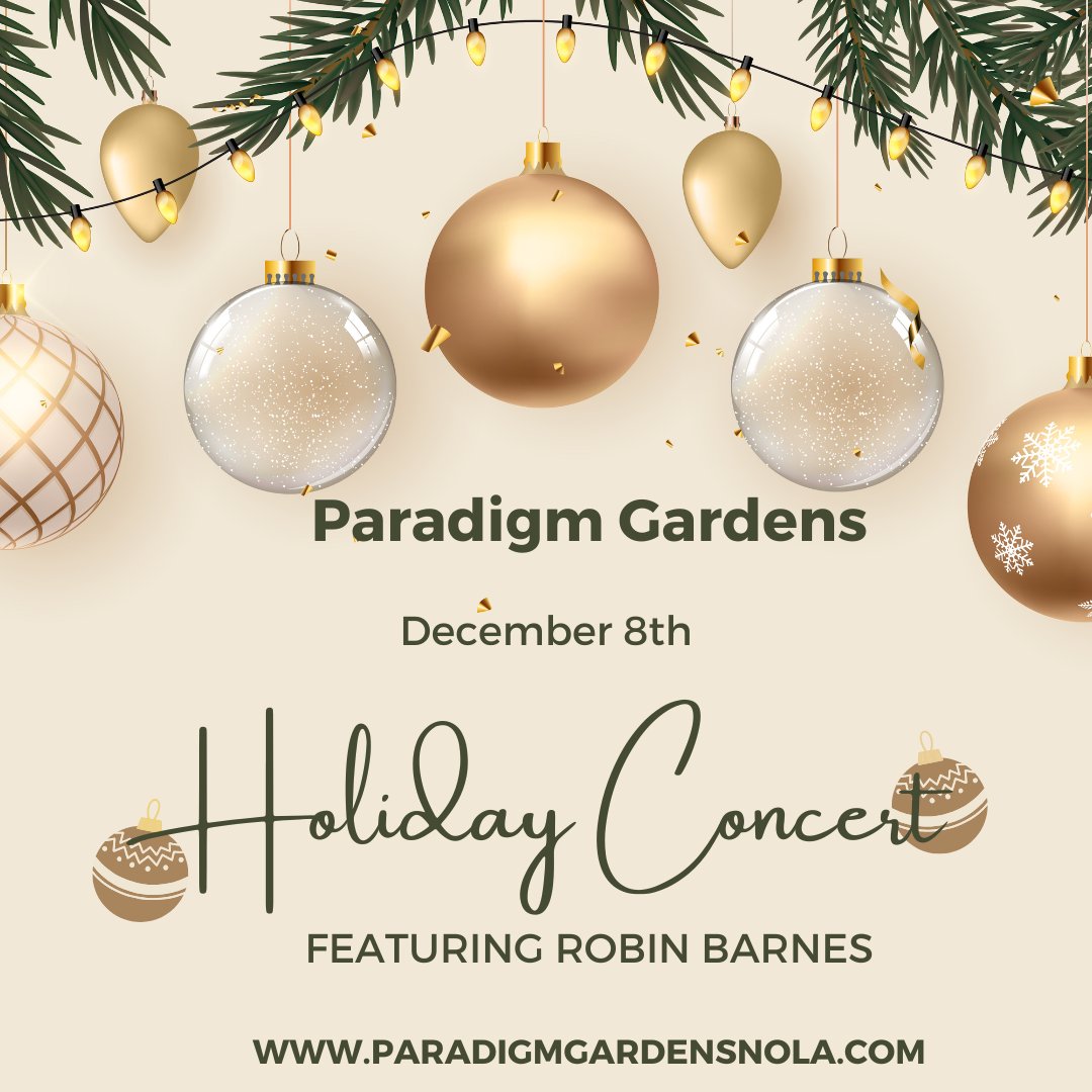 New Orleans Sonbird Robin Barnes and her band will perform her stupendous renditions of holiday standards in the verdant, magical oasis of Paradigm Gardens.